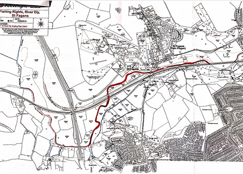 GAC fishing on River Ely Starts in the first field as you leave Fairwater, Cardiff on Cardiff Road (single North bank fishing only) for a short distance until the River goes under a railway bridge (circa 150m). The River returns into the next field from underneath another railway bridge. From here we have double bank fishing through and past St Fagans, under another railway bridge, until you reach circa 50m before the A4232 dual carriage way (circa 2.2kms of double bank fishing). From here the fishing is single bank North bank fishing of river only. This single bank fishing continues under the A4232 all the way to a point where the Nant Dowlais enters the River Ely just north of the village of St Georges (circa 1.7kms). |