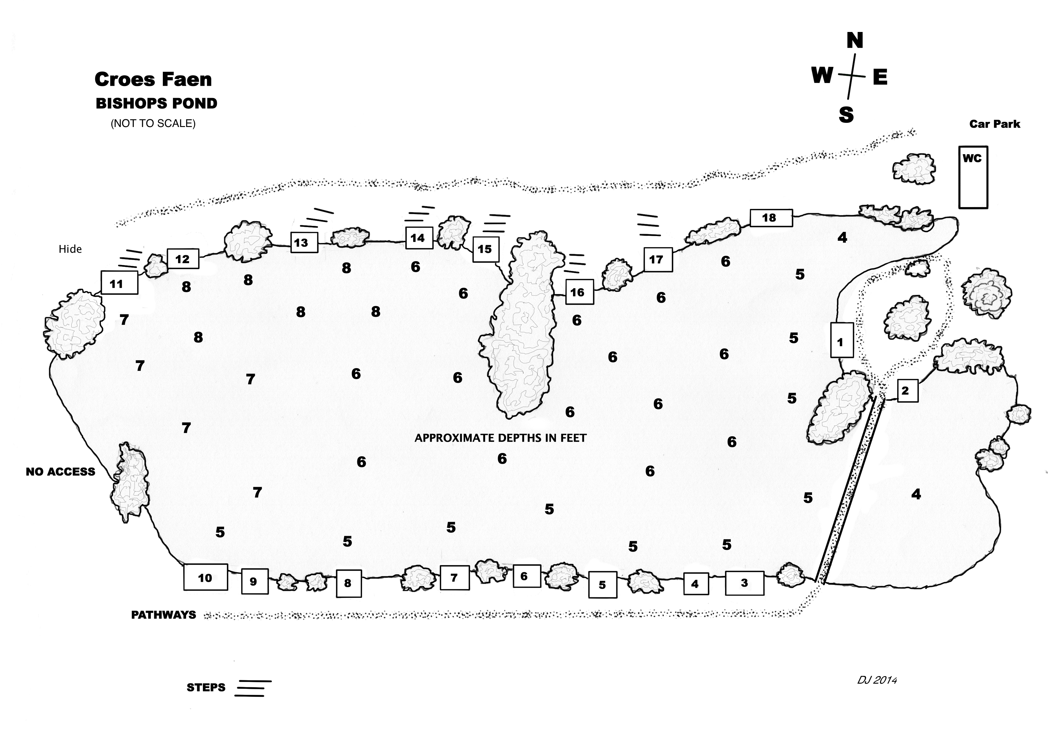 Bishops Pond was opened to members on 4th July 2011, it is a 2.5 acre farm pond. New fishing pegs and a small bridge have been built to upgrade the old platforms and create easier access for club members. Would all members be aware that the paths around the pond do get slippery in wet conditions and please be careful when fishing the car park bank pegs as the water is over 6ft deep in some of the margins. What 3 words Groes faen car park = clearcut.tempting.weeds